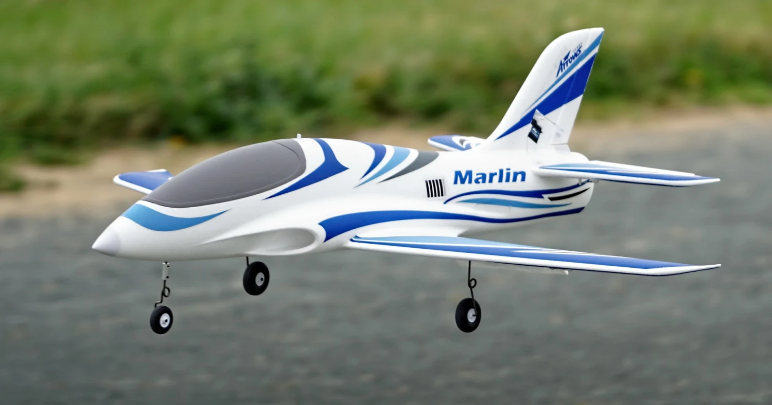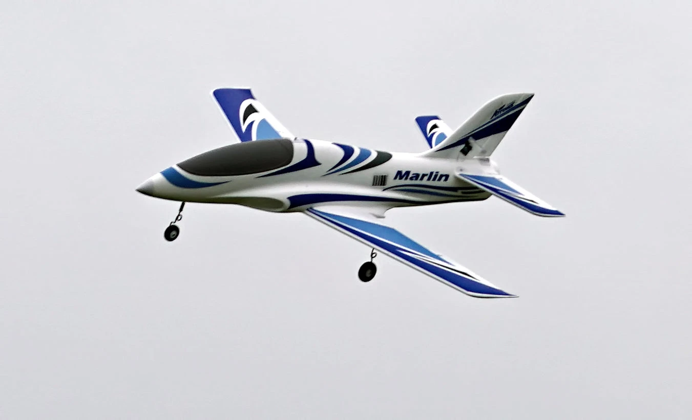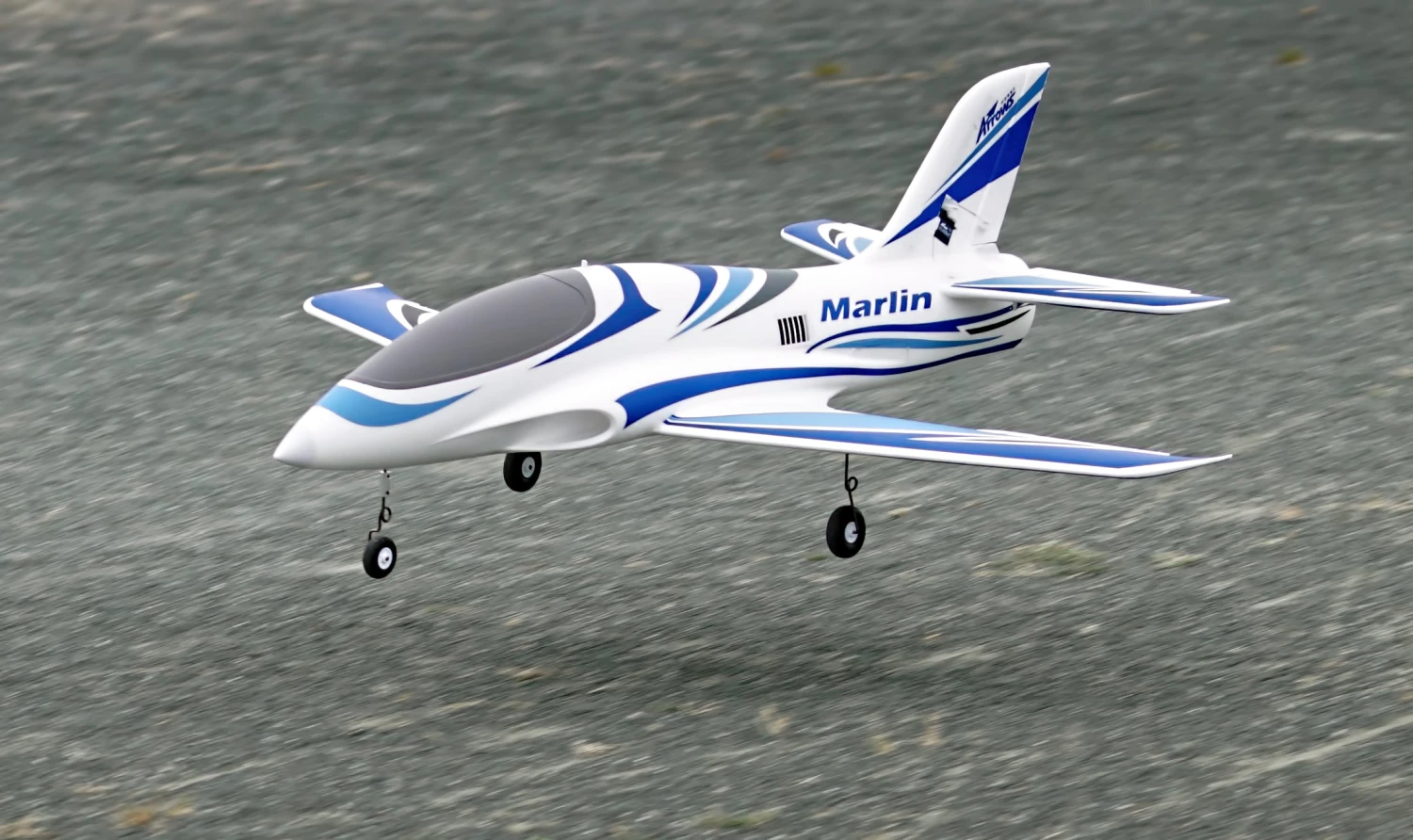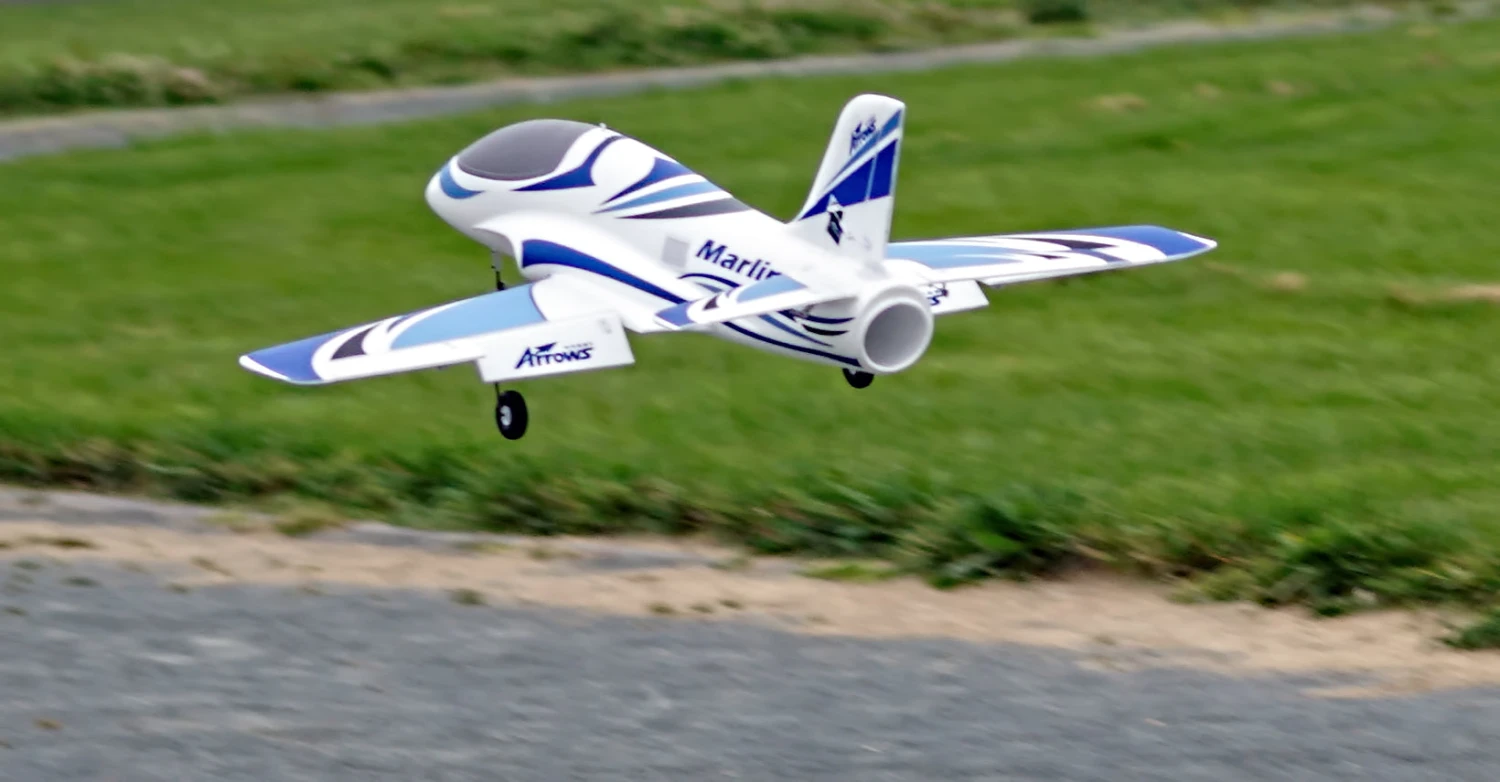 Something different! The Arrows Marlin 64mm EDF is an ALL NEW design with the beginner to intermediate pilot in mind. This plane has a more robust fixed landing gear than most, to handle bumpy landings. More importantly it is the only plane in its class to have flaps to shorten takeoff, and to make approaches and landings more like those of a high wing trainer. The 3150kV motor combined with a 40 Amp ESC, and a powerful 64mm 11 blade EDF, ensure plenty of power for takeoff and maneuvers. The fan sounds like a real turbine.