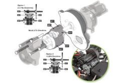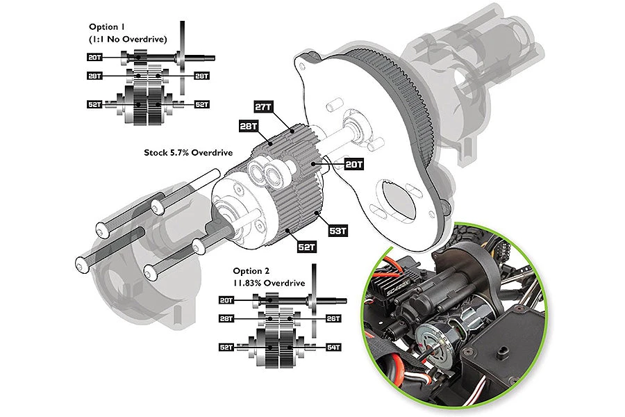 Stealth X Gearbox With Adjustable Overdrive Gears: At the heart of the Enduro is our revolutionary Stealth X gearbox. Although the exterior appears to have a conventional 3-gear transmission look, the inside is far from conventional. The Stealth X features the ability to adjust the rear drive ratio independently of the front drive across three levels: stock overdrives the front end 5.7% (installed in RTR), option 1 provides a one-to-one drive ratio front-to-rear (available separately), and option 2 overdrives the front end 11.83% (included with RTR).