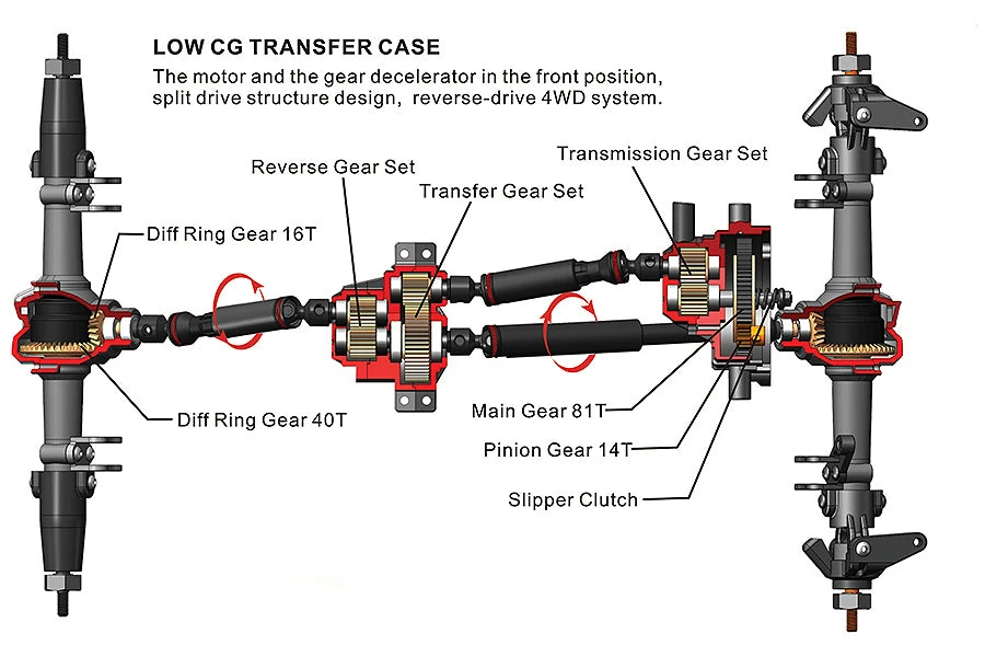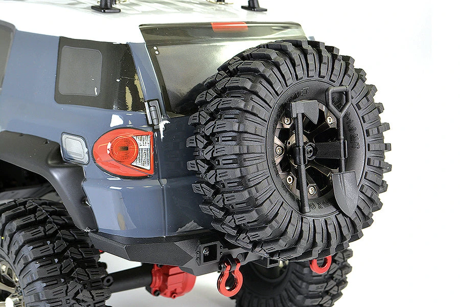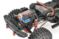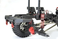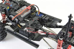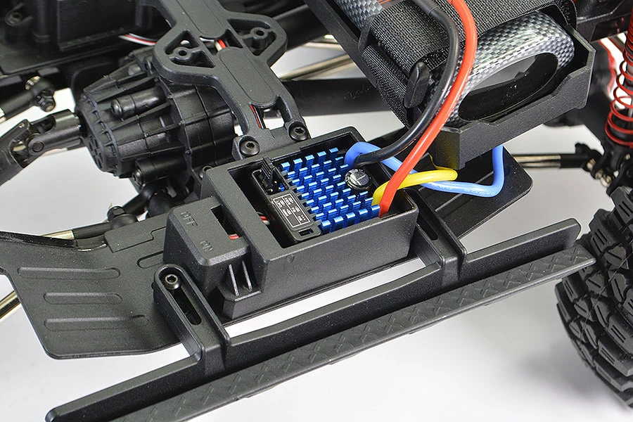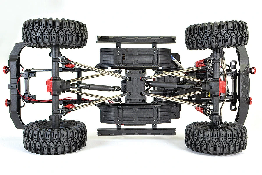 Underneath the GEO utilises a split-transmission design that provides a lower centre CG transfer case to help accommodate interiors, provide better low speed torque and minimise torque twist. The battery has been moved further forward and along with the front positioned motor and 15kg metal geared steering servo taking on inclines has never been easier, especially with the beadlock wheel mounted Fastrax Matador tyres!