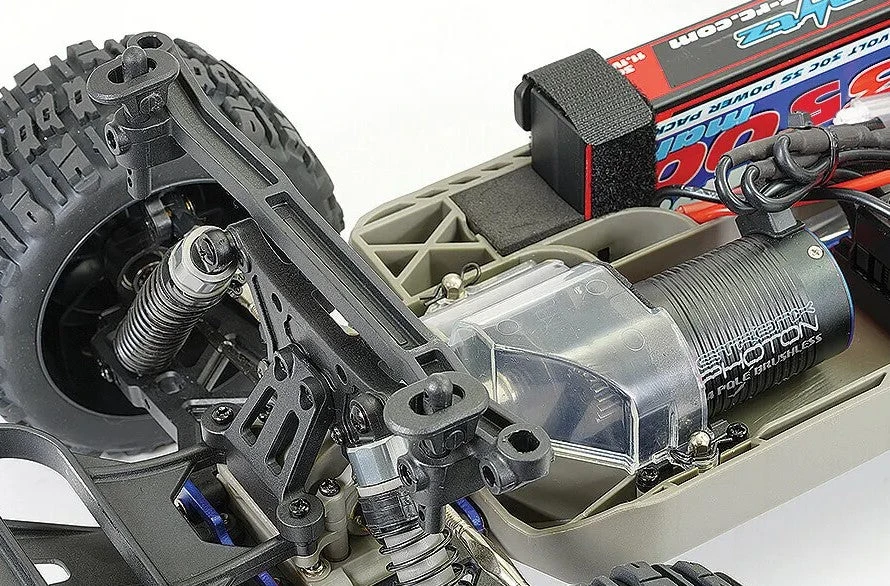 Front and rear shock absorbing bumpers and skid plates, hidden inside the bodyshell provide out of sight protection. Aggressive treaded pattern tyres, wider on the rear for extra traction are mounted to 8-spoke wheels and include a functional spare.