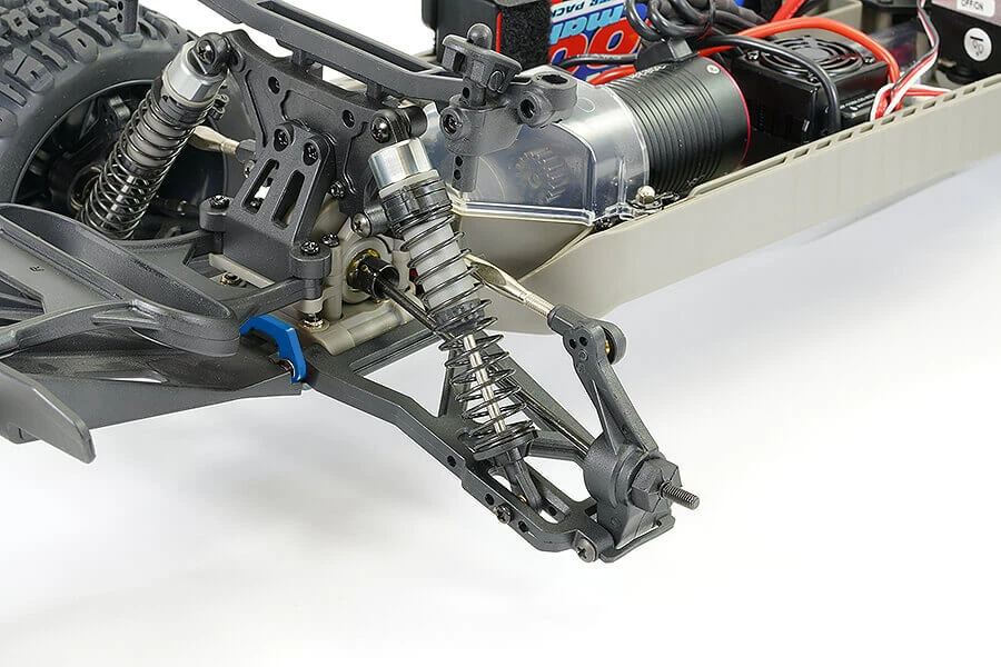 Front and rear shock absorbing bumpers and skid plates, hidden inside the bodyshell provide out of sight protection. Aggressive treaded pattern tyres, wider on the rear for extra traction are mounted to 8-spoke wheels and include a functional spare.