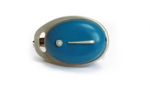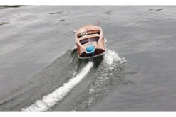 Shapely retro outboard engine of the 60s. With flexible shaft drive, underwater unit in siberian gray, hood in turquoise blue with silver details such as handle and filler neck.