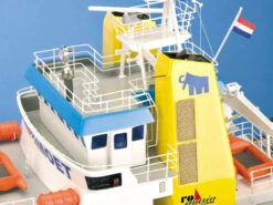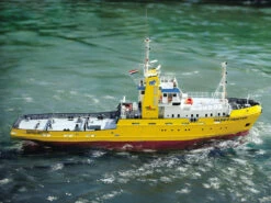 The boat is powered by a direct-drive, i.e. non-geared system, in the form of two high-torque MAX Power 700 electric motors. These are low-revving power plants driving a pair of high-performance marine propellers. Fixed Kort nozzles increase thrust, and the boat is capable of carrying out extremely arduous towing tasks and complex manoeuvres in conjunction with the bow thruster, which is an optional accessory. The capacious plastic hull allows the modeller to install numerous auxiliary working systems, and experienced builders will enjoy fitting out the Happy Hunter with a working lighting system, radar, anchor winch, sound system and towing mechanism. It is even possible to install a fully working crane; the crane itself is included in the kit.