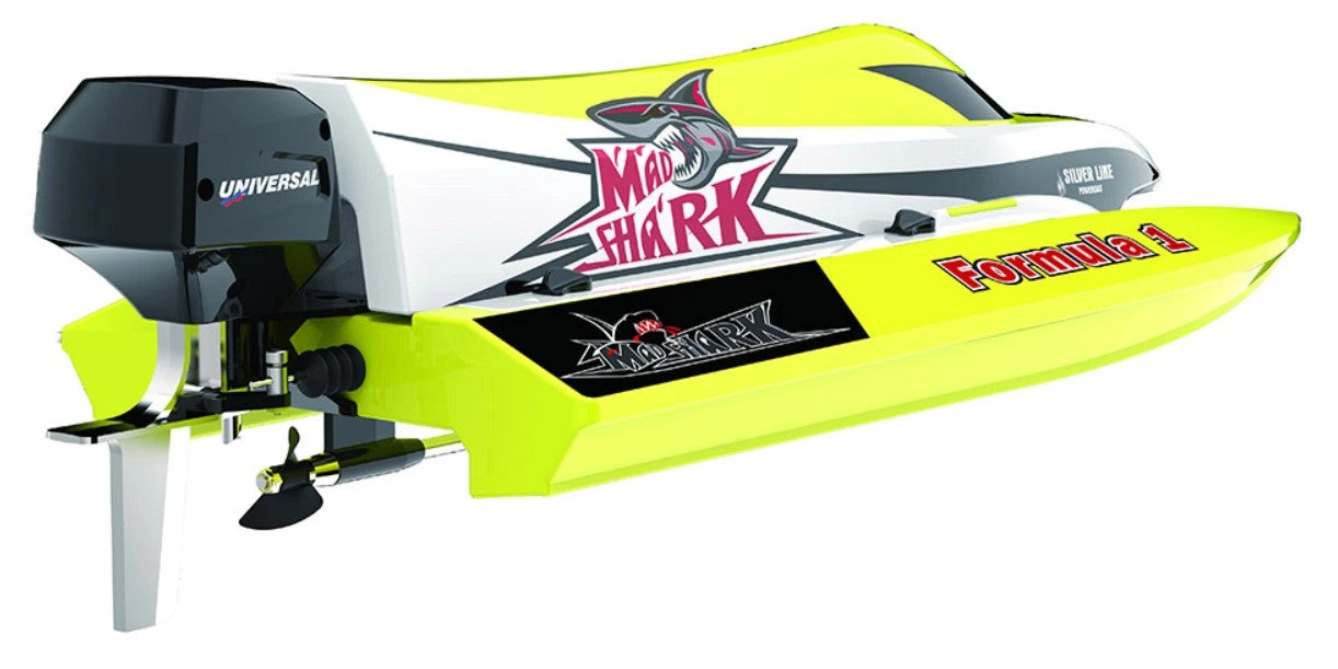 The Mad Shark is inspired by the adrenalin filed high octane world of Formula1 racing boats. The wide hull ensures stability in high ‘G’ cornering and the catamaran style hulls keep a much of the boat out of the water as possible to the highest top speed. The hull is moulded from tough plastic and features a clever water pocket design to allow the boat to self-right itself should you flip upside down so you don’t need to get your feet wet to save it.
