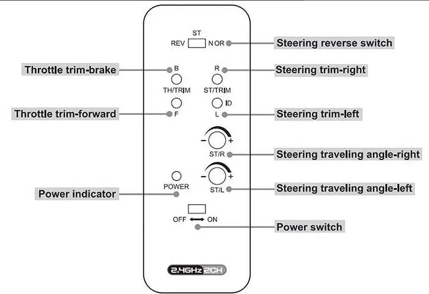 - Hobby style radio with steering trim, Throttle trim, travel angle adjustment.
