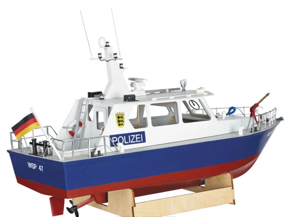 The WSP47 is a semi-scale replica of a typical police boat. This model is impressive not only because of its pleasing appearance and simple structure, it also allows some nice detail. A fire extinguisher monitor and a radar is included in the basic kit and an optional pump and radar-drive motor are available to give full functionality.