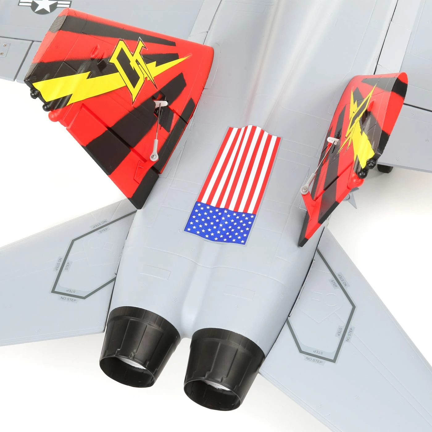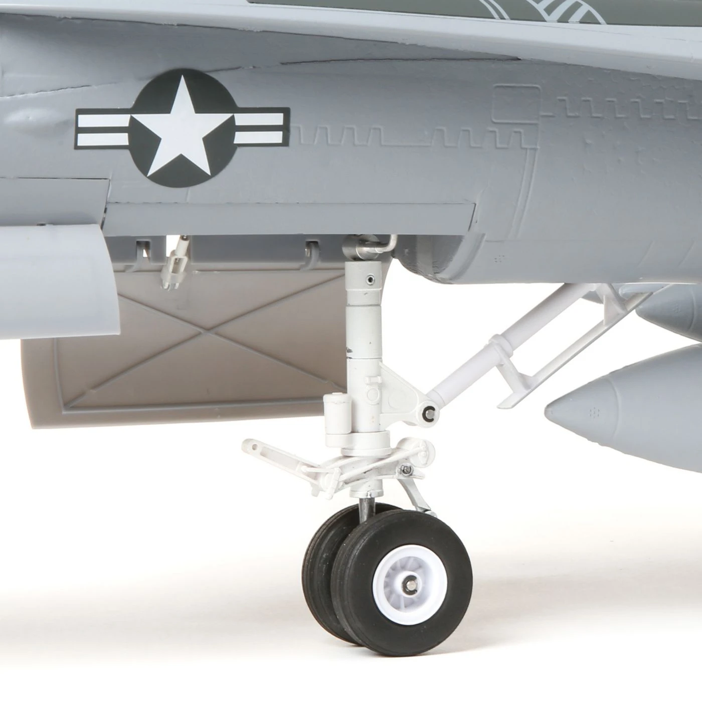 The steerable nose gear with dual wheels and the rotating main gear feature reliable, factory-installed electric retracts equipped with durable metal components including Extra Scale painted trailing-link, shock-absorbing struts. It’s the most scale-like landing gear installed on an F-18 EDF model yet!