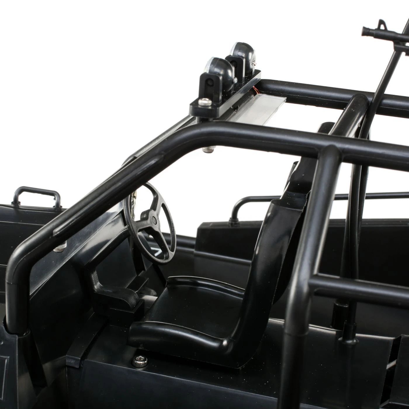 Run the Pro Boat Aerotrooper 25-inch Brushless Air Boat practically anywhere. Even on land! Featuring a 2080kv 480 Brushless outrunner motor with 3-blade airplane-style prop mounted above the hull, you can explore large bodies of water, plant-infested swamps, small grass fields, and even snow and ice. Keeping with the theme, a tactical/military hull scheme with removable guns, moulded handrails, and cage add to the scale realism. Plus, the scale cockpit with seat and steering fits most action figures. Injection molded two-piece composite canopies are durable with a secure restraint system keeping all electronics safe during use. LED lights mean the fun doesn’t stop when the sun goes down. Explore new terrain with a one-of-a-kind boating experience.