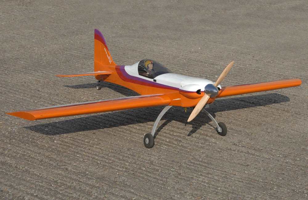 The light yet strong built-up structure is assembled from CNC cut balsa and ply components, the airframe then being covered in heat shrink film in this attractive colour scheme, the tough fibreglass cowling being carefully painted to match. The very complete kit includes all dedicated hardware, including control accessories, fuel tank, alloy undercarriage with wheels and even a high quality aluminium spinner!