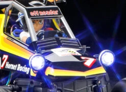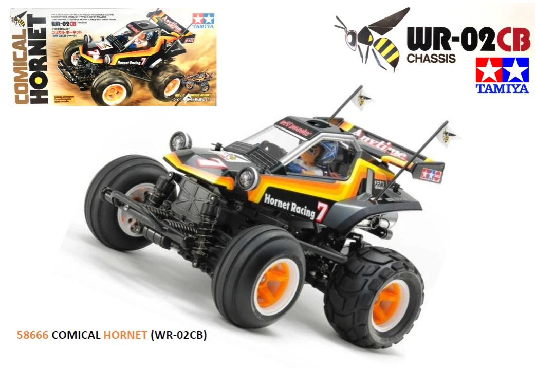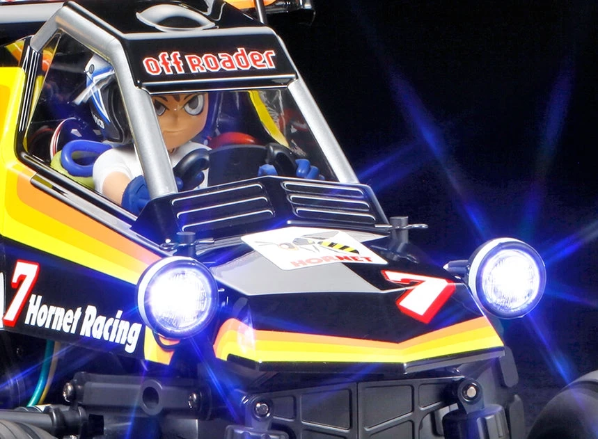 1984 was a year to remember for fans of Tamiya and R/C in general, with the debut of the Hornet; fans from that generation – and brand new fans, too – can now welcome the Comical Hornet, a buggy assembly kit which gives a new twist on the 1984 classic. The fun Hornet-inspired body is molded in lightweight and durable polycarbonate, with stickers and masking stickers also included. Light cases are compatible with separately-sold 5mm diameter LEDs. Also included is a T-shirted driver figure, with a choice of visor or chin guard for the helmet, plus stickers for decoration that include no less than five different eye designs. The model is based upon the exceedingly fun WR-02CB chassis.