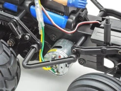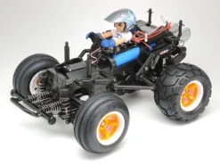 The WR-02CB chassis is an exciting chassis at home on- and off-road, providing smooth driving and the potential for exciting wheelies! It features a pre-assembled gearbox with motor already attached to save hassle in the assembly process. Long suspension arms and CVA oil dampers make for excellent off-road performance, while underguard and side guards give great protection. A rear wheelie bar helps support the model when it leans back, maintaining a fun wheels-in-the air stance as the model plunges forward. Orange and white 2-piece wheels are joined by bubble tires (front: ribbed, rear: round block) for a fun look and drive.