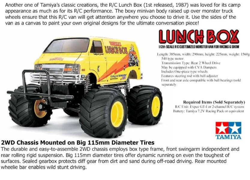 The Tamiya Lunch Box is another great classic re-creation of days gone bye, the R/C Lunch Box which was first released in 1987 was loved for its fun appearance as much as for its R/C performance.