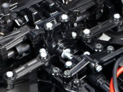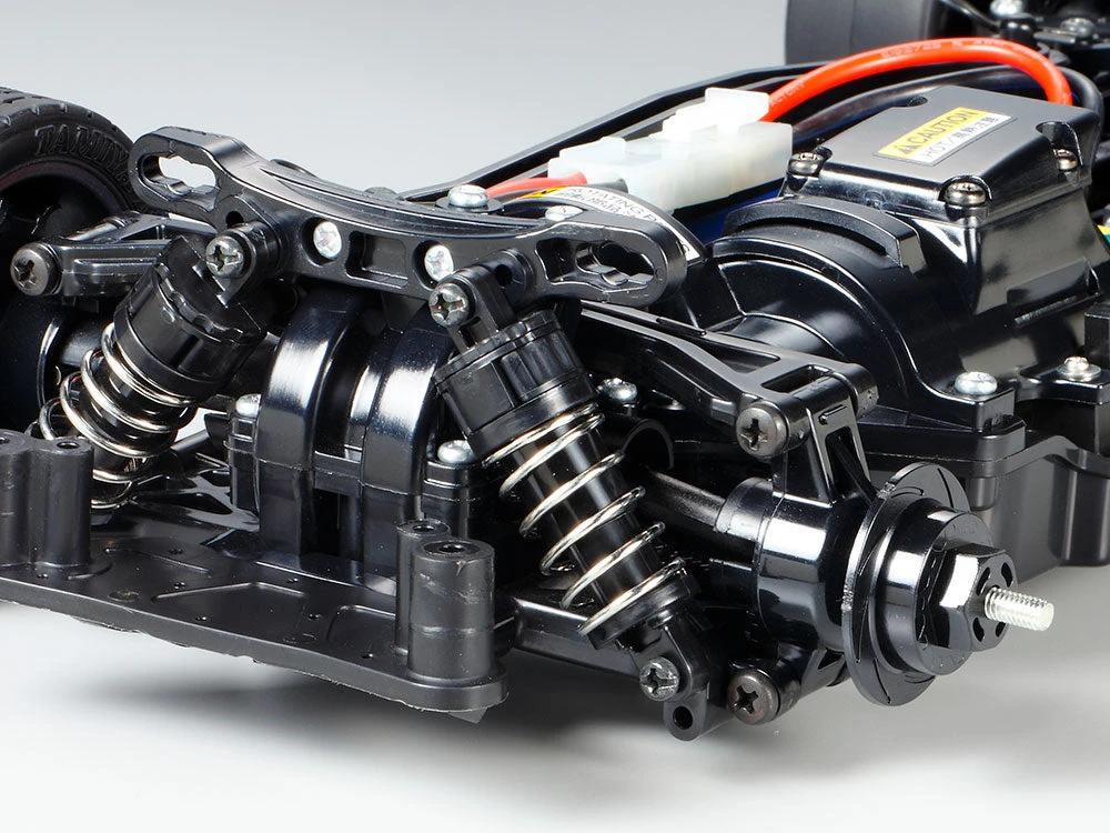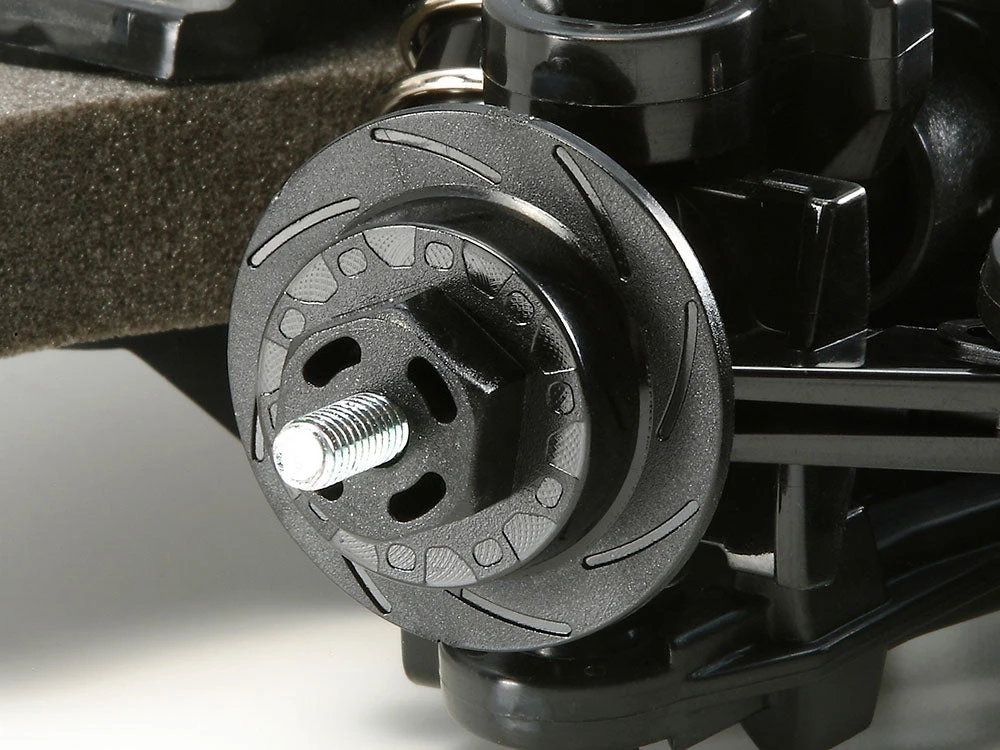 The shaft-driven 4WD TT-02 chassis employs a longitudinal layout with the battery on the left and the motor on the right, to give excellent stability. In addition, it features identical left and right suspension arms and uprights for ease of assembly, plus easy-to-maintain gearboxes. It is a highly adaptable chassis, as it offers 2 different wheelbases, 2 ground clearance settings and 2 tread set-ups in addition to a range of 10 possible gear ratios. It is not short on looks either, with brake disc-shaped wheel hubs and stylish front bumper supports. Gun metal color dish wheels and tread-pattern tires make for a racy finish.