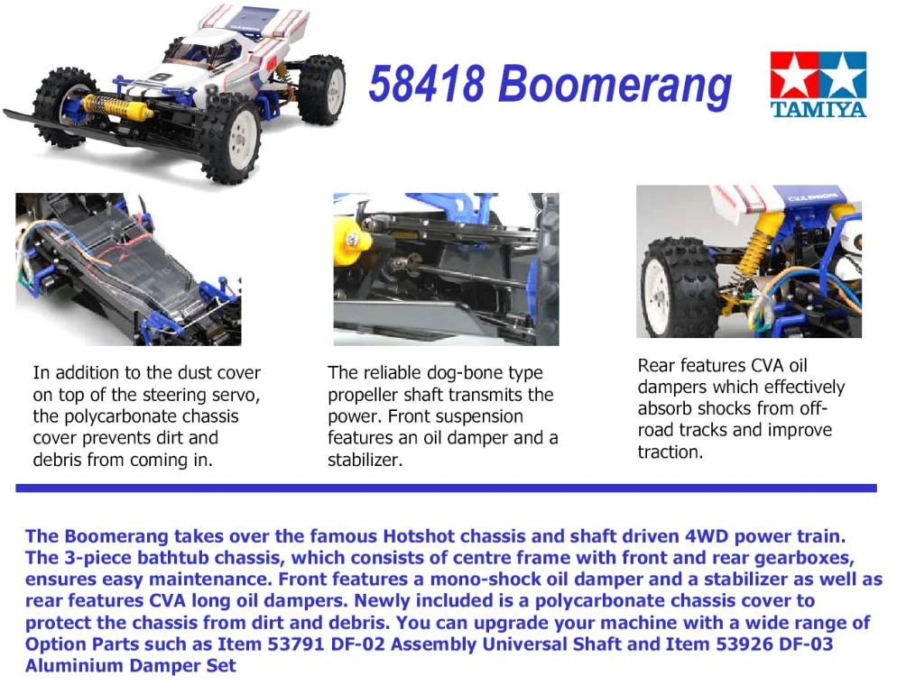 Tamiya designers have given this re-released Boomerang a makeover replacing older, harder to assemble parts with modern equivalents, but still keeping true to the spirit of the original Boomerang.