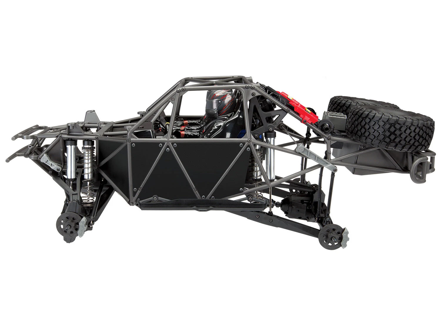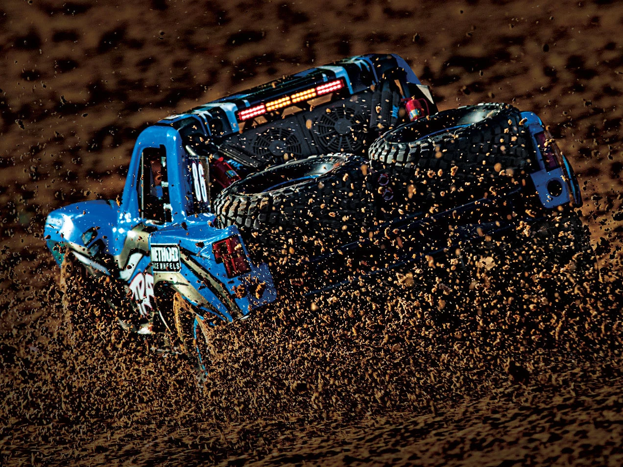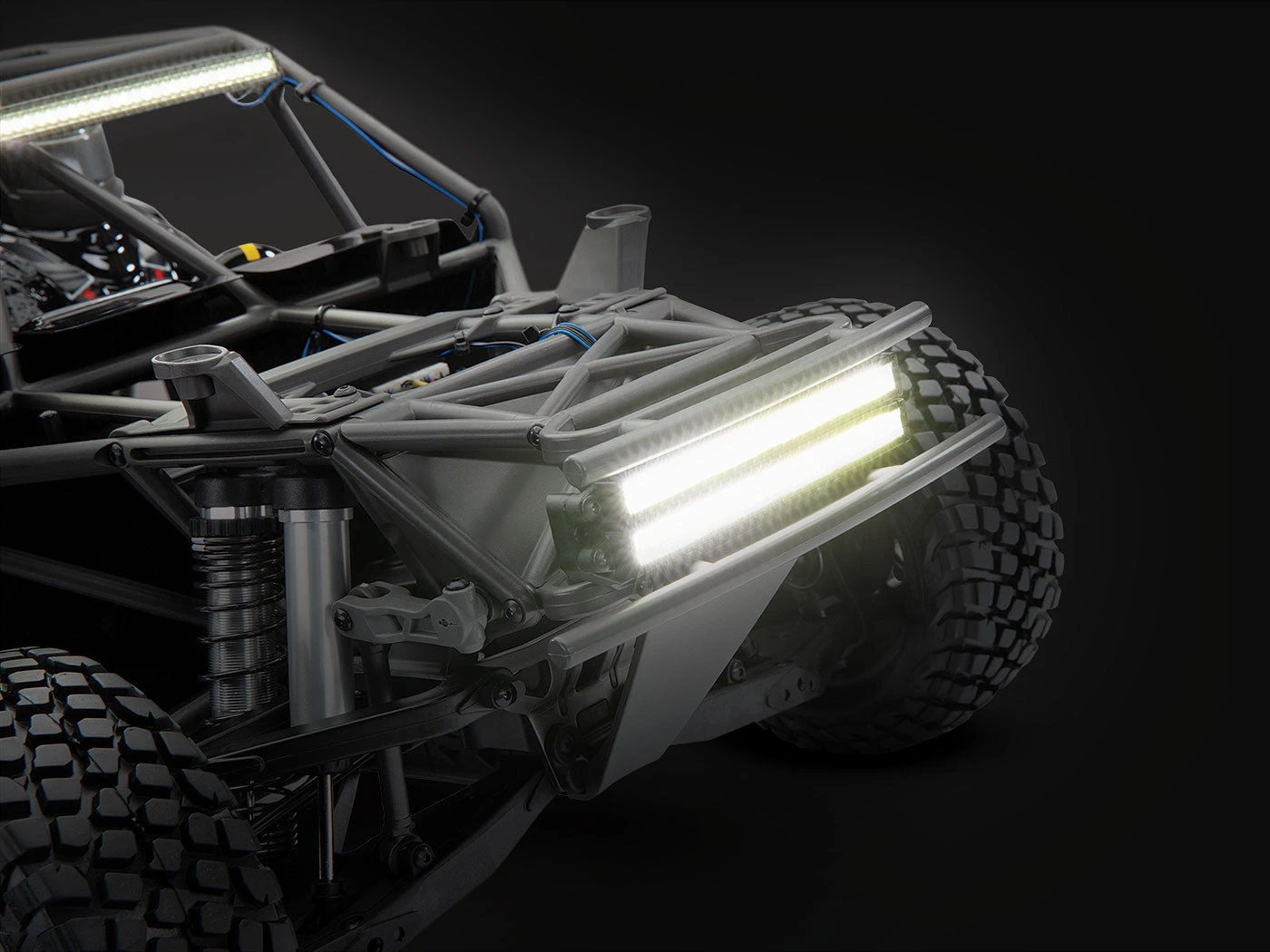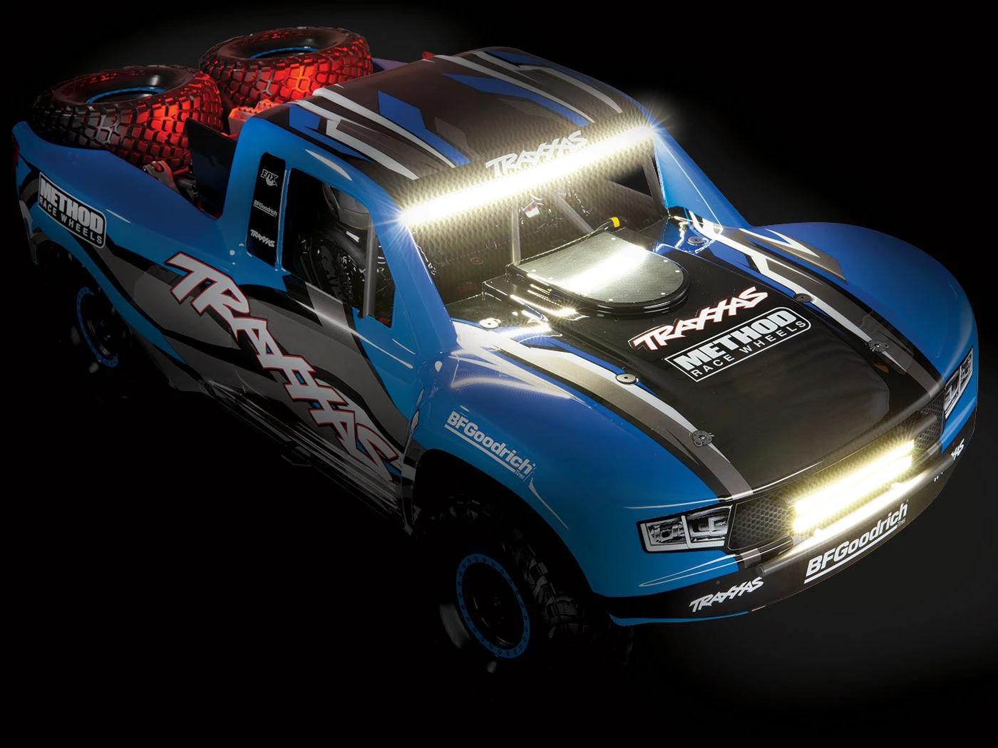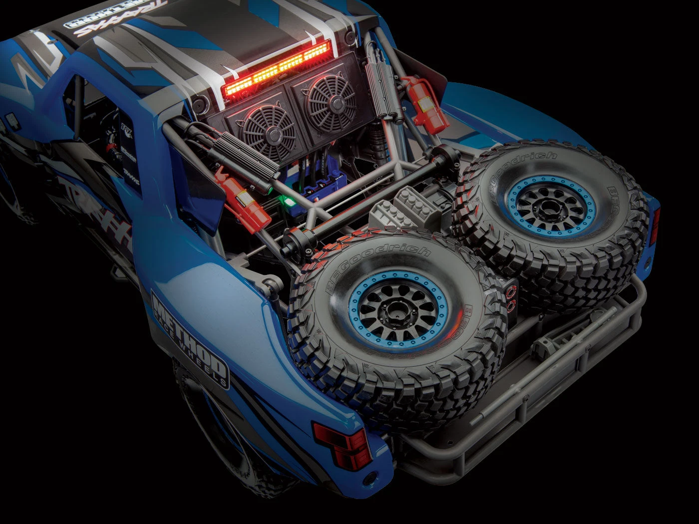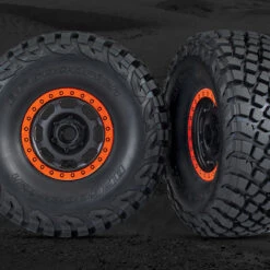 Aggressive replica BFGoodrich KR3 tyres ride on tough 17mm hex Desert Race wheels (Fox) or licensed Method Race wheels (RIGID) with bright beadlock rings. The tyres are scale replicas of the 40 inch tyres used on the top trucks in the desert.