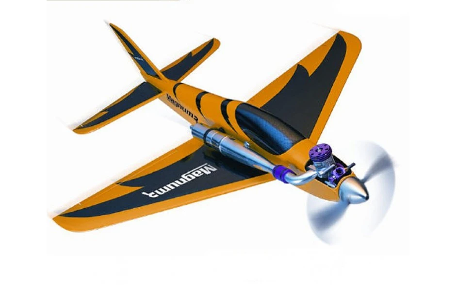 The MagnumR has undergone a recent facelift and restyling making it even sleeker and faster in the sky. Now covered in metallic yellow Oracover with a carbon effect canopy and high visibility chequered film on the underside of the wing for better orientation in the sky. The MagnumR is not for the faint hearted with speeds in excess of 200MPH -sure to put a smile on anyones face! With its sleek, jet style appearance the only way to describe the MagnumR is simply ballistic.Construsted from balsa, light ply and fibreglass with a high speed laminar flow section made from balsa-covered foam.